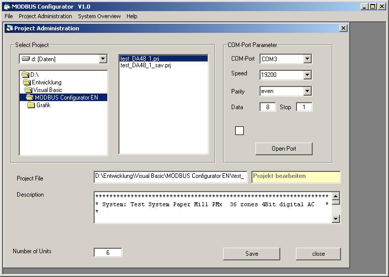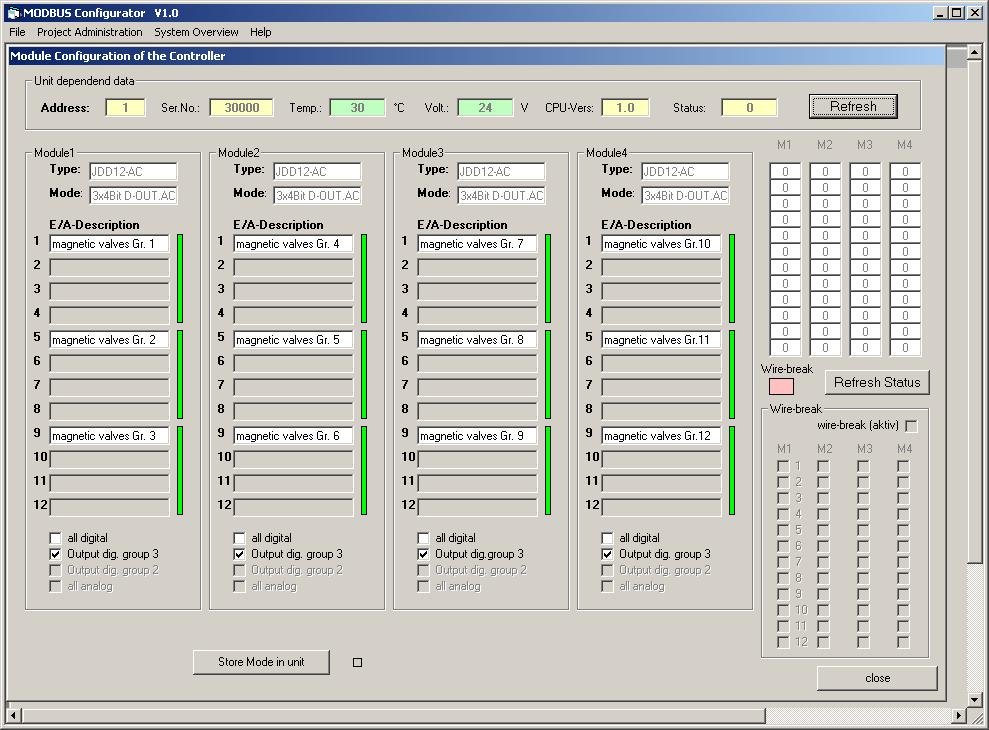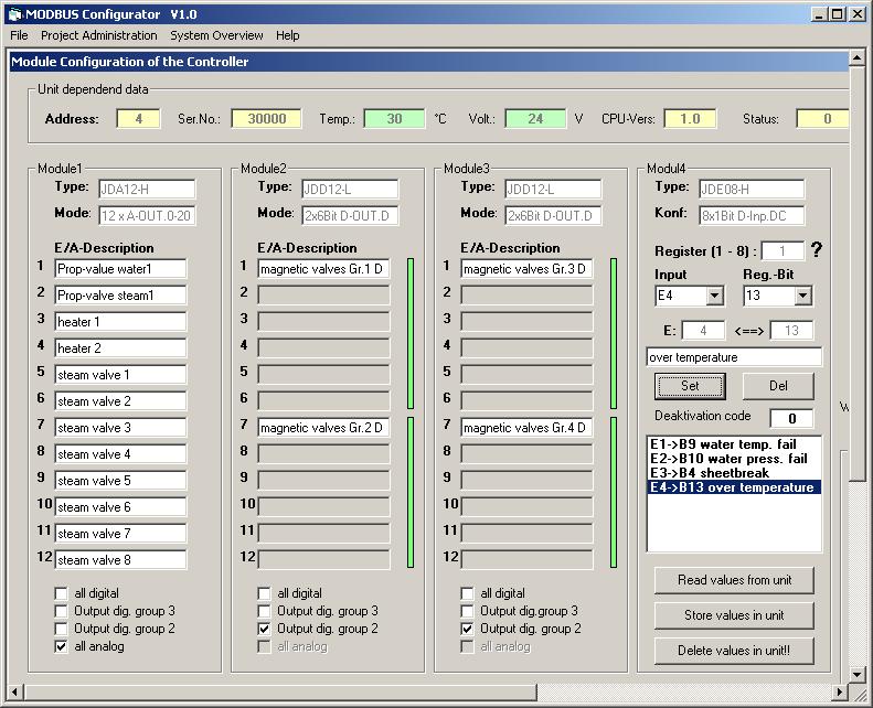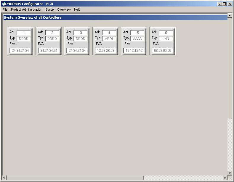 To administrate our controllers JDA48-1-/1-4 we have developed a special configuration software. The software allows administration and documention of complex system structures. Below some screenshots of the software and resulting documention are represented . The software is running under WIN-XP or WIN7.